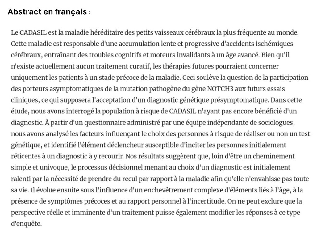 - Akrich, Rabeharisoa, Paterson, Chabriat, J of Neurol 2024. Abstract (résumé) disponible en français ici